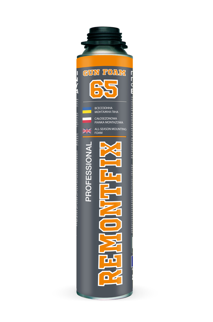 REMONTFIX — це професійна однокомпонентна поліуретанова піна з високим виходом, призначена для використання з монтажним пістолетом. Завдяки всесезонній формулі, піна ефективна в широкому діапазоні температур і є ідеальним рішенням для монтажу, герметизації та ізоляції в різноманітних будівельних роботах.